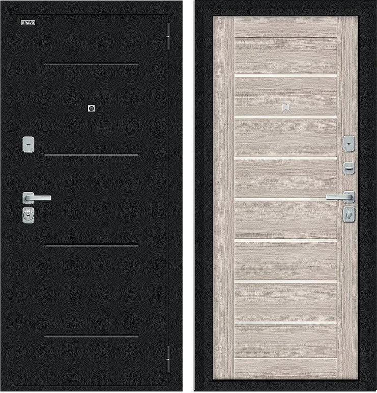 Надежная входная Дверь Браво Техно/BChrome Букле черное/Cappuccino Melinga премиум класса по цене 32 700 руб. Большая толщина стали защитит от проникновения в ваш дом, квартиру или коттедж. Используется очень качественная фурнитура: замки, цилиндры, ручки, защелки. Покрытие и отделка двери изготовлено под внимательным контролем производителя. Дверь имеет долгий срок службы и гарантию.