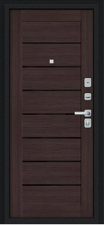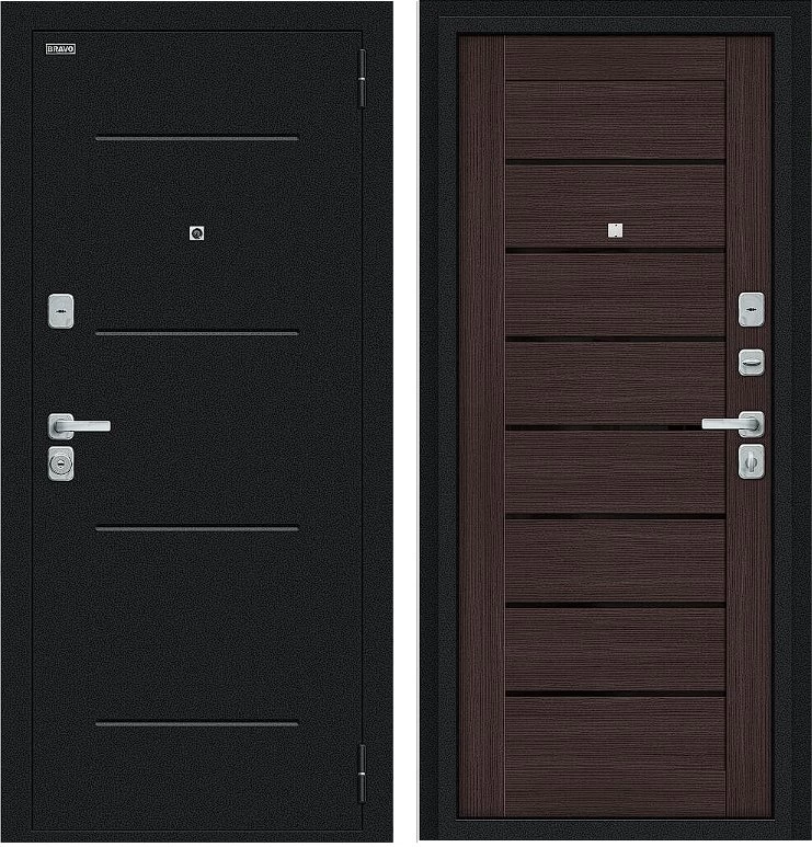 Надежная входная Дверь Браво Техно/BChrome Букле черное/Wenge Melinga премиум класса по цене 30 800 руб. Большая толщина стали защитит от проникновения в ваш дом, квартиру или коттедж. Используется очень качественная фурнитура: замки, цилиндры, ручки, защелки. Покрытие и отделка двери изготовлено под внимательным контролем производителя. Дверь имеет долгий срок службы и гарантию.